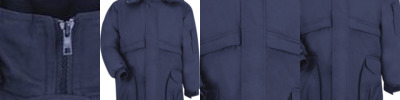 • Two concealed zippered pockets at waist, two lower insulated bellows with concealed snap flap, zippered pocket on left bicep, pencil pocket underside of storm flap