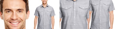 2.8 oz. 55/45 cotton/polyester; 2 chest pockets with button flaps; Hem sleeves ; Chainstitching on bottom hem; Modern Fit;