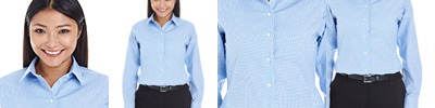 3.9 oz./yd² / 132 gsm, 60% cotton, 40% polyester dobby with wrinkle-free and stain-release performance; Stain-release and true non-iron performance straight from the dryer; Active fit; Patent pucker-free taped seams; Specially fused collar, cuffs and placket for total garment performance; Straight collar with built-in collar stays; Princess seams in front and back for a feminine fit; Fine yarn-count shirting with pealized buttons; Adjustable cuffs with button placket;