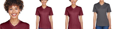 100% polyester wicking knit with True Hue Technology™ that helps prevent dye migration; Moisture-wicking; Ladies' fit; Tear away label; V-neck collar; Fully reversible; Each layer hemmed separately for embellishment;