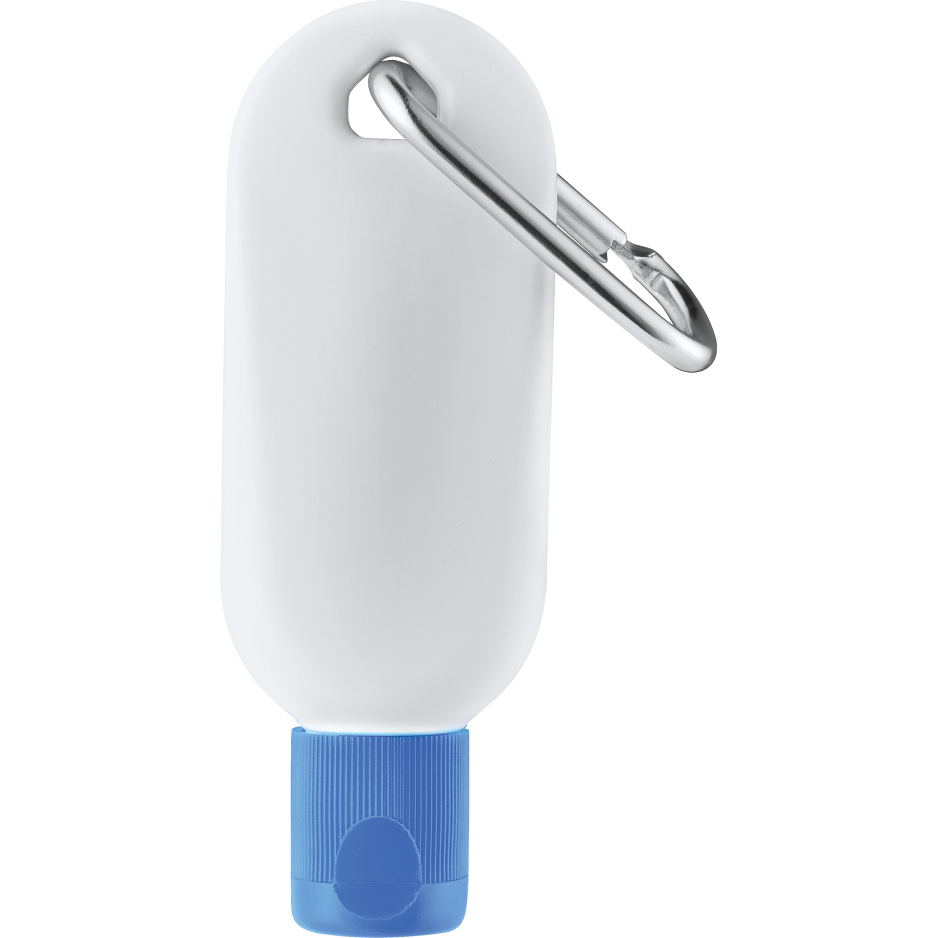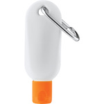 The 1.5oz SPF30 Clip-N-Go Sunscreen is in a tottle bottle with flip-top lid. It includes a silver mini-metal carabiner, meets FDA requirements