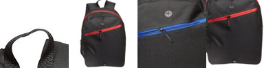 - Rubber headphone jack on front above angled zipper pocket with accent color stitching
