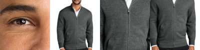 Blending professionalism with supreme comfort, this beautiful tri-blend sweater is an exceptional addition to any work wardrobe. 56/29/15 cotton/nylon/acrylic Fully-fashioned seams Machine washable 1x1 rib knit collar, cuffs and hem Antique silver zipper pull Front pockets
