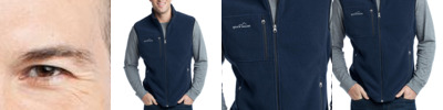 Ward off early morning chills by insulating your core with this soft, cozy vest. Contrast rolled top collar, zippered chest pocket, reverse coil contrast zippers, front zippered pockets with tricot lining, binding at armholes and an open hem. Contrast Eddie Bauer logo embroidered on right chest. Made of 12-ounce, 100% polyester fleece which incorporates Low Impact Technology™ for enhanced softness and performance.